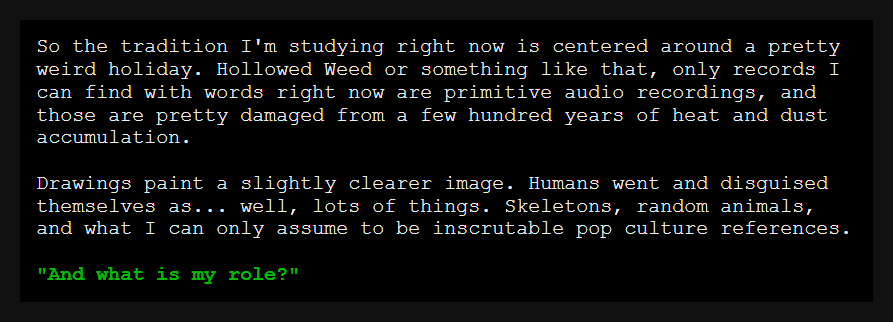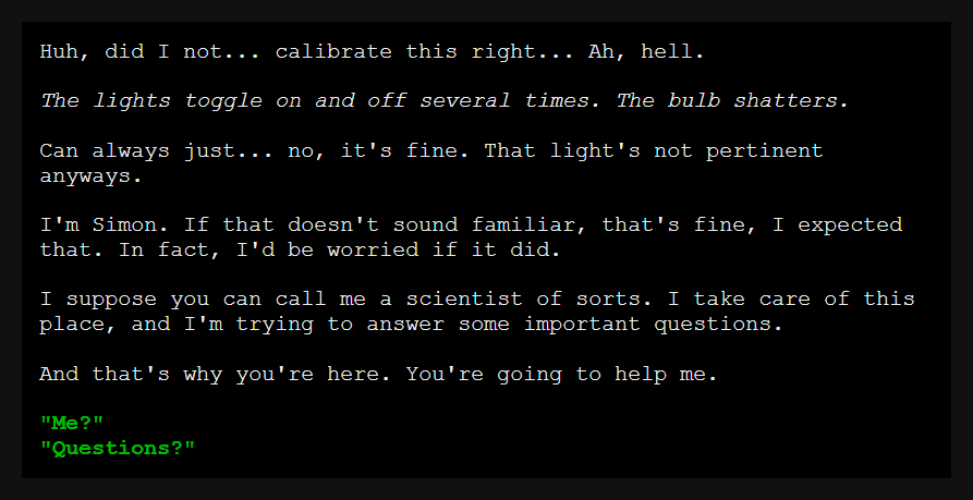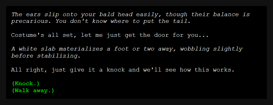 An evolution in my Twine style, making use of audio and player choice within a very different structure than my previous stories. Fans of my previous stories will enjoy the dark humor. Newcomers will enjoy the sharp dialog. Both will come to enjoy exploring the mysterious world Simon inhabits.I'm proud of how this turned out. While not the subtlest story I've ever told, I'm happy with the emotion I managed to bring out of the character. I think I managed to weave audio into the format in an effective way, and my dialog is as sharp as ever.This was intended to be a series of short interactive stories, each exploring a different ritual and gradually unraveling the story of Simon. This effort was derailed multiple times by health and personal issues, and will likely not be restarted in this form. I leave this here as a relic of what could have been.