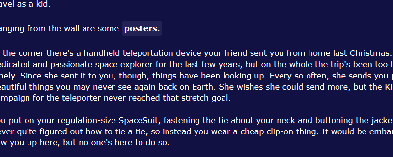 You wake up on board the Space Cruiser DONTPANIC. Get on your SpaceSuit, wander its halls, and stare down the empty space outside your window.